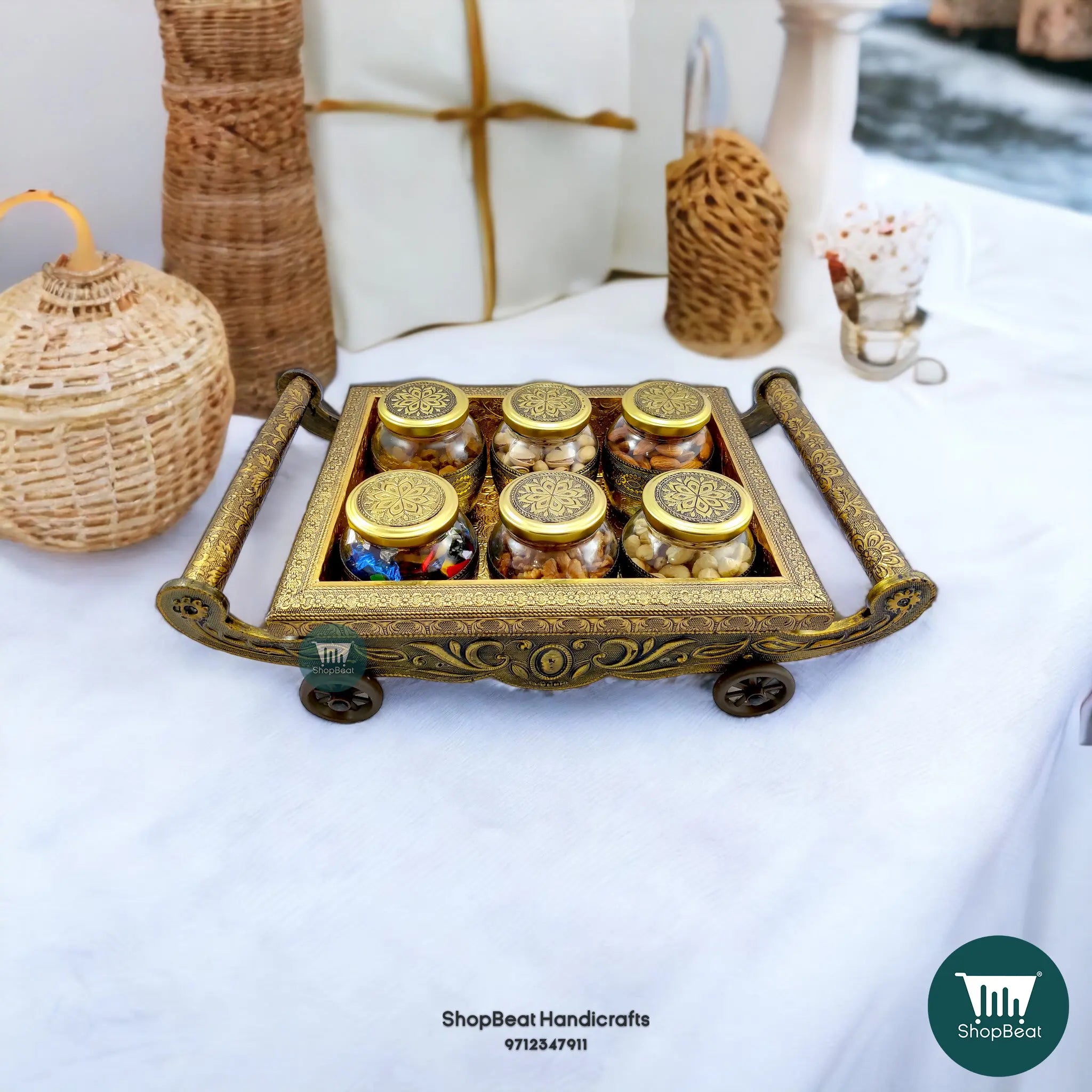 Golden Oxidised Wooden Dry Fruit Box – 4-Wheel Cart with 6 Glass Jars 17x10 | ShopBeat