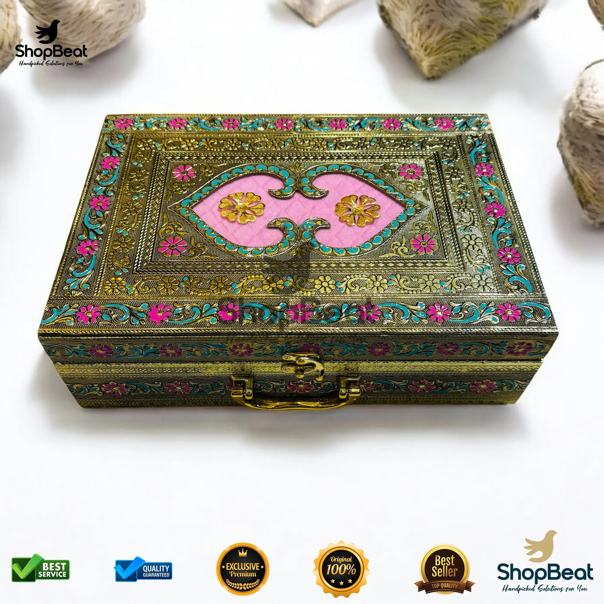 The ShopBeat Golden Oxidised Pink Velvet Dry Fruit Box With 6 Glass Jar is a luxurious handcrafted gifting box that brings elegance and tradition together. Designed with an oxidised golden finish and soft pink velvet, this decorative box is perfect for festivals, weddings, and corporate gifting.