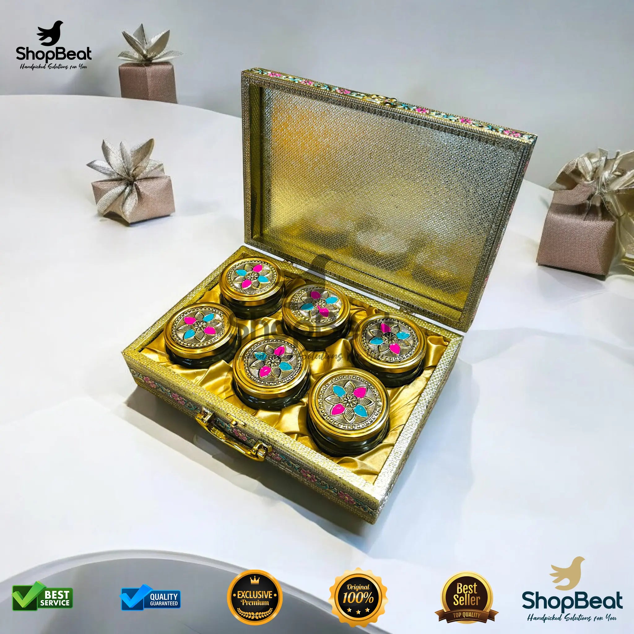 Make your gifts extra special with the ShopBeat Golden Oxidised Pink Velvet Dry Fruit Box With 6 Glass Jar. Order now and impress your loved ones or corporate clients with premium gifting!