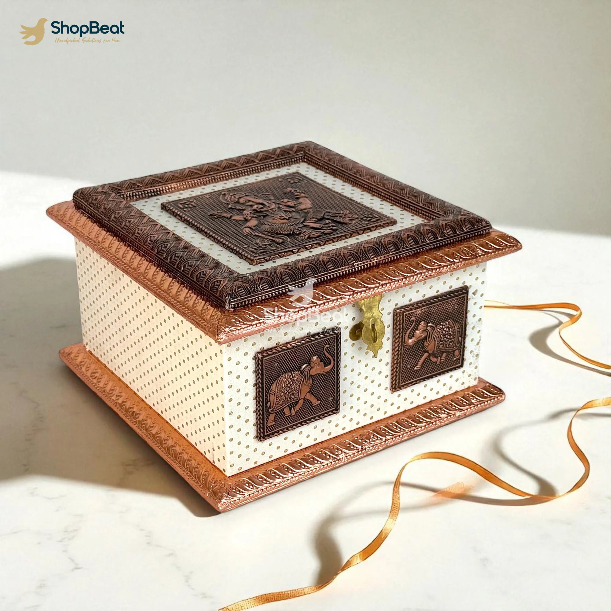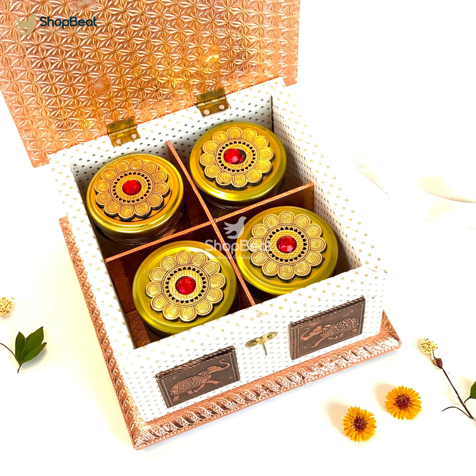 White Rexine Copper Decorative Dryfruit Box With 4 Glass Jars