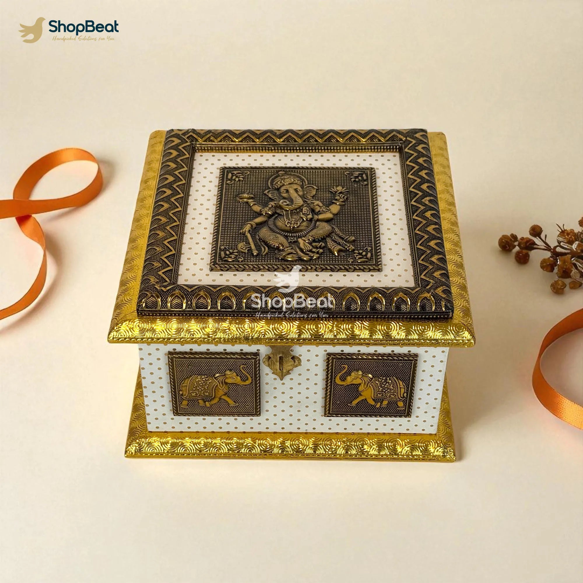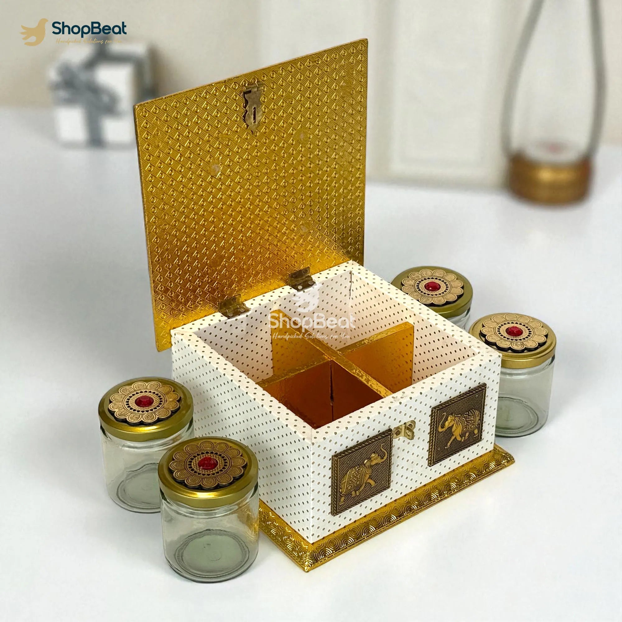 White Rexine Golden Decorative Dryfruit Box With 4 Glass Jars