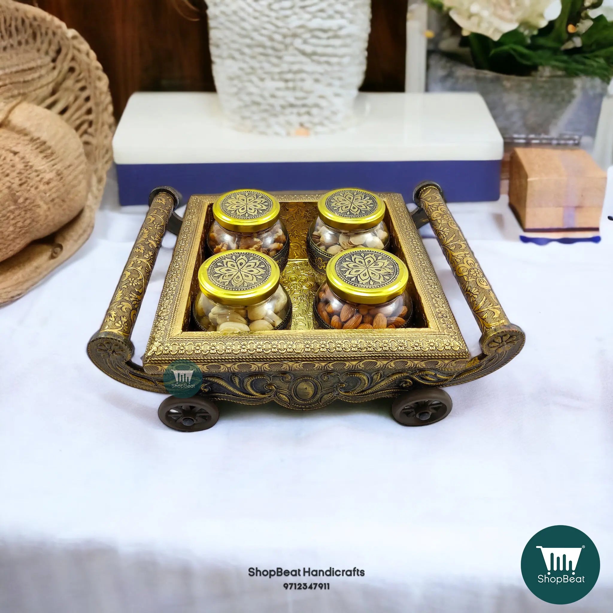 Golden Oxidised Wooden Dry Fruit Box – 4-Wheel Cart with 4 Glass Jars 12x10 | ShopBeat