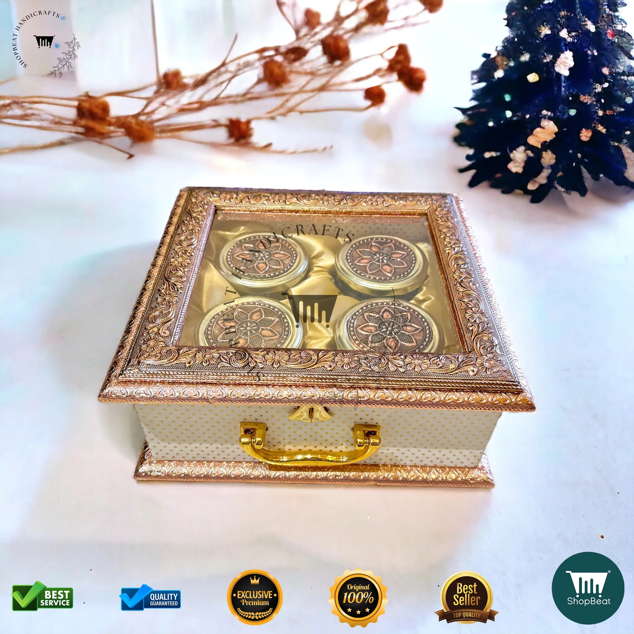 The Copper Oxidised Acrylic Gift Box 4 Jars is an exquisite handcrafted dry fruit box designed for festivals, weddings, and corporate gifting. Featuring a luxurious copper oxidised finish and an acrylic transparent window, this box is perfect for elevating your gifting experience.