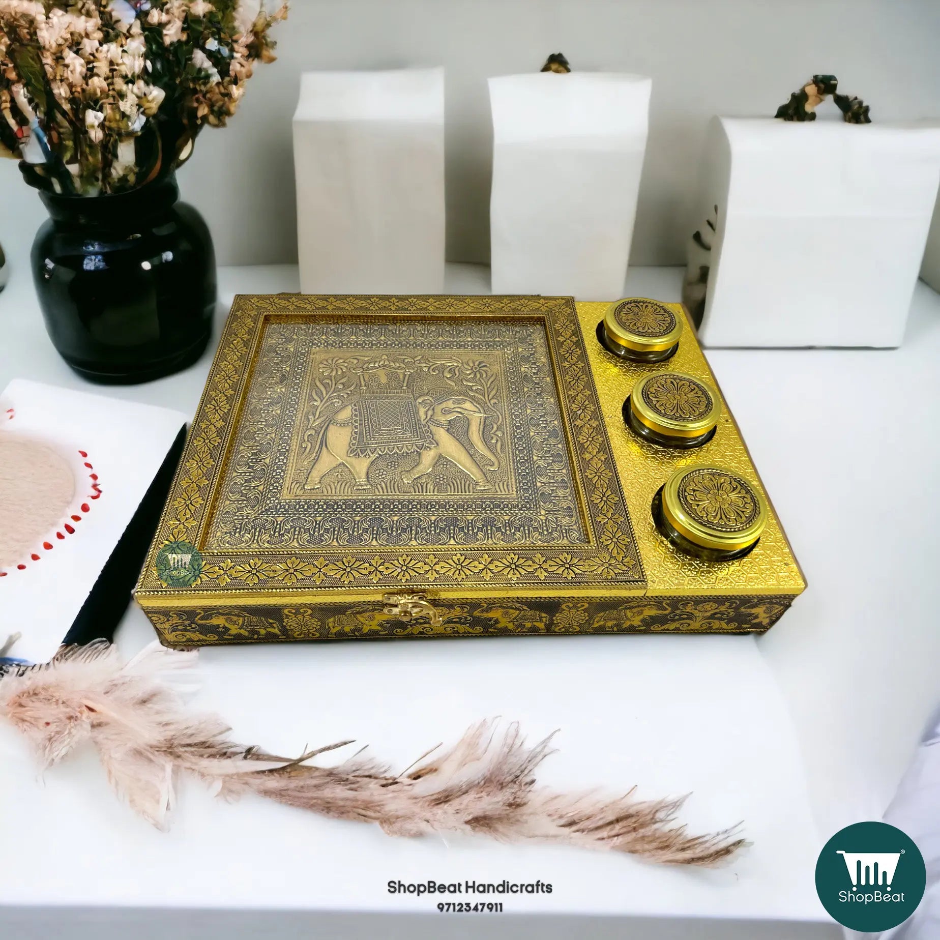 Golden Oxidised Wooden Dry Fruit Box – Elephant Design with 3 Glass Jars 16x12 | ShopBeat
