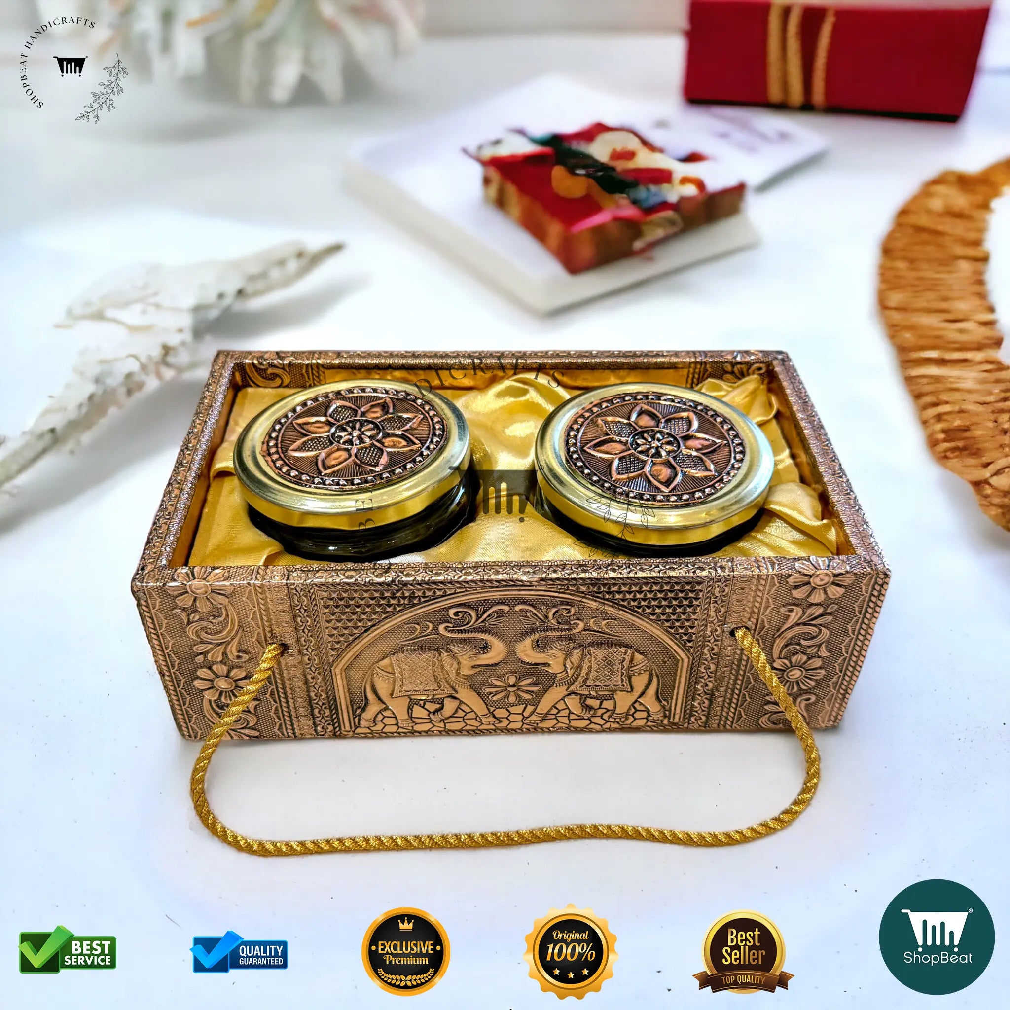 Designed with an intricate elephant motif and a rich copper oxidized finish, this box symbolizes prosperity and elegance. It’s an ideal choice for festivals, weddings, corporate gifts, and housewarming presents.