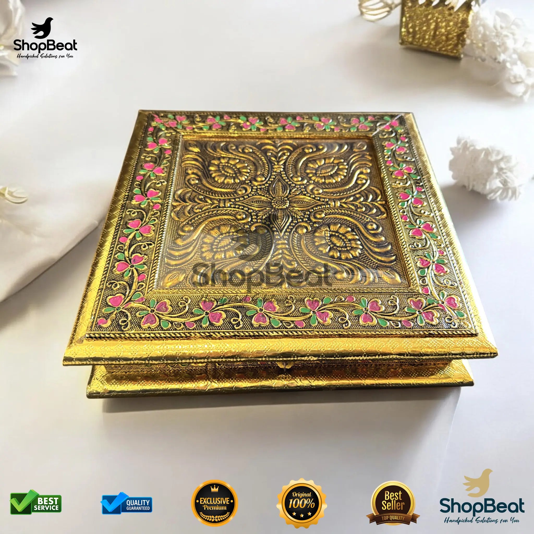 Golden Oxidised Wooden Dry Fruit Box – Flower Design 10x10 | ShopBeat