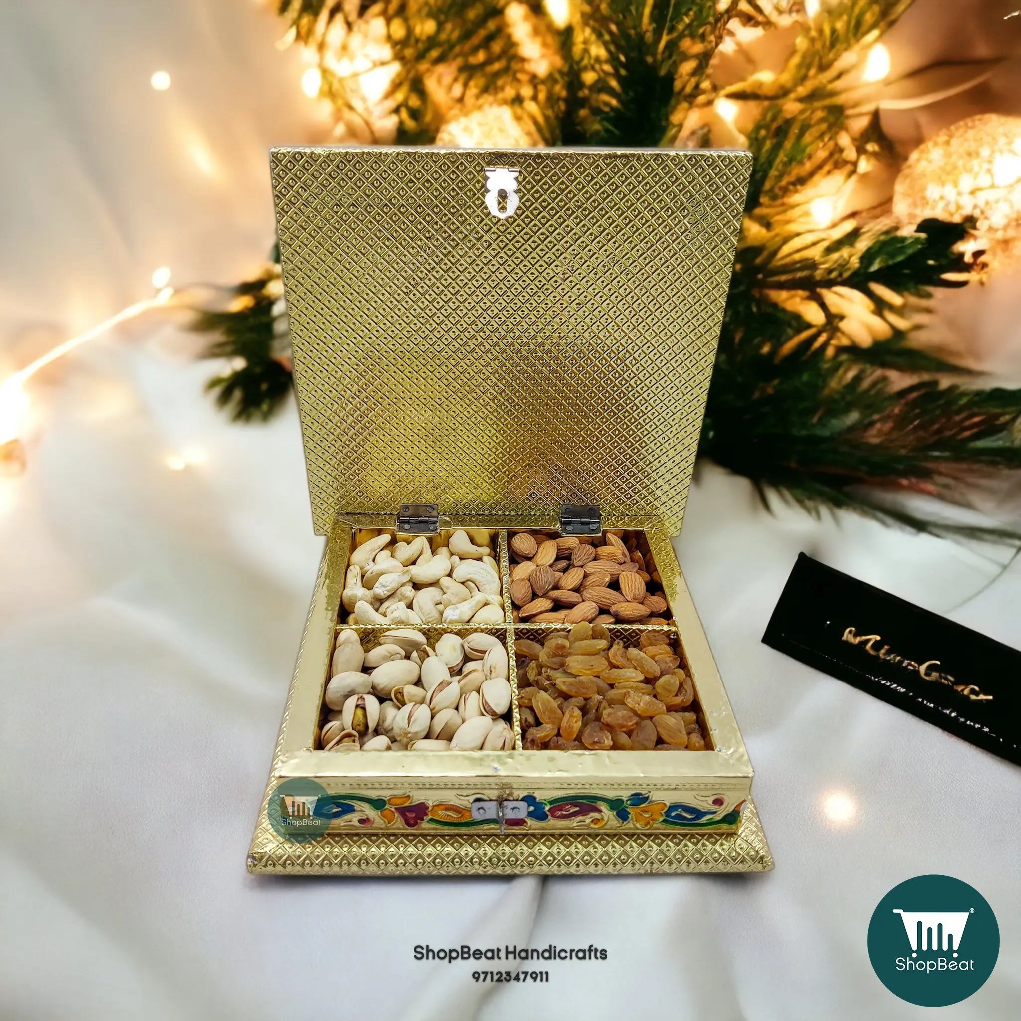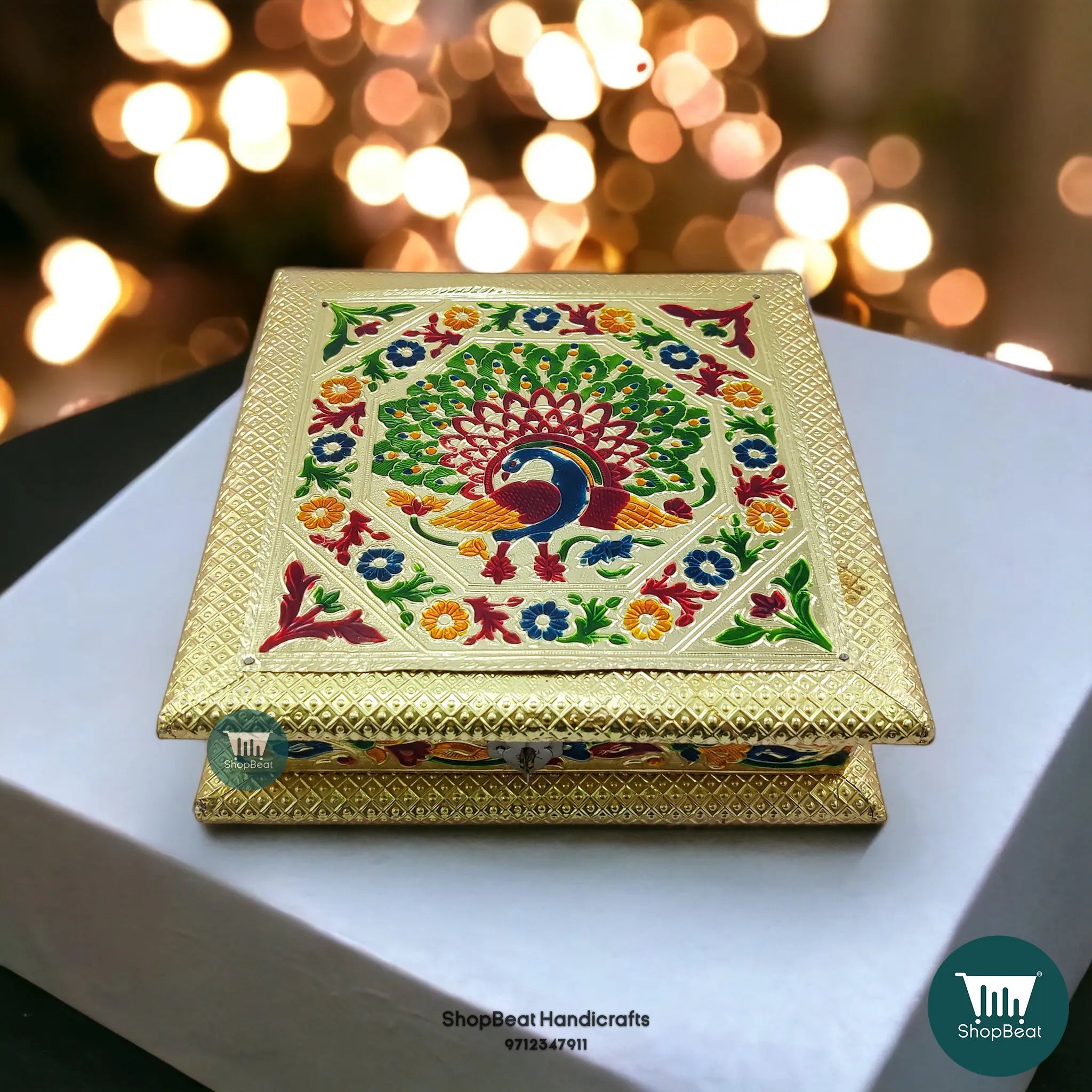 Golden Meenakari Wooden Dry Fruit Box – Peacock Left 8x8 | ShopBeat