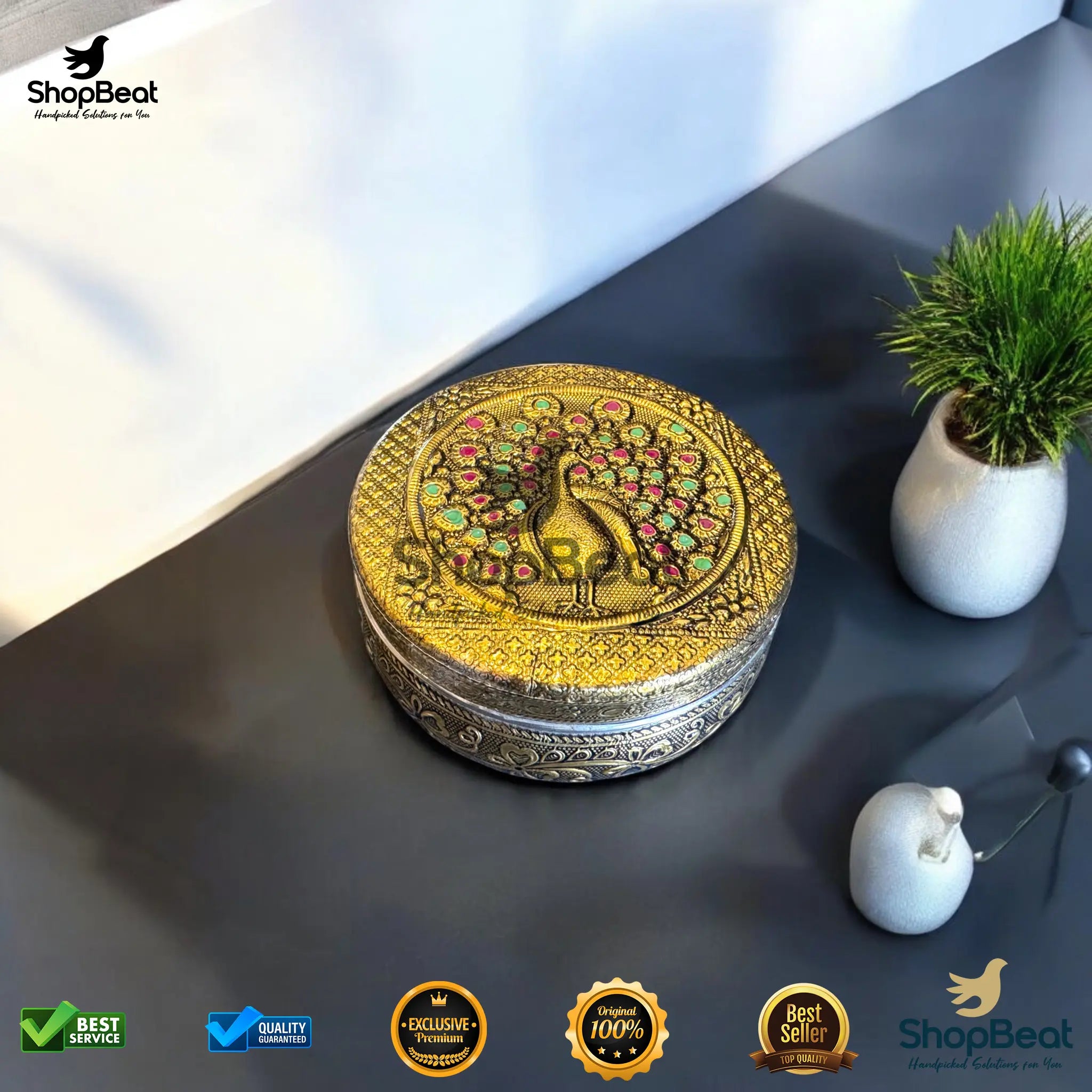 Golden Meenakari Peacock Steel Box – 9 No. Embossed Gift Container