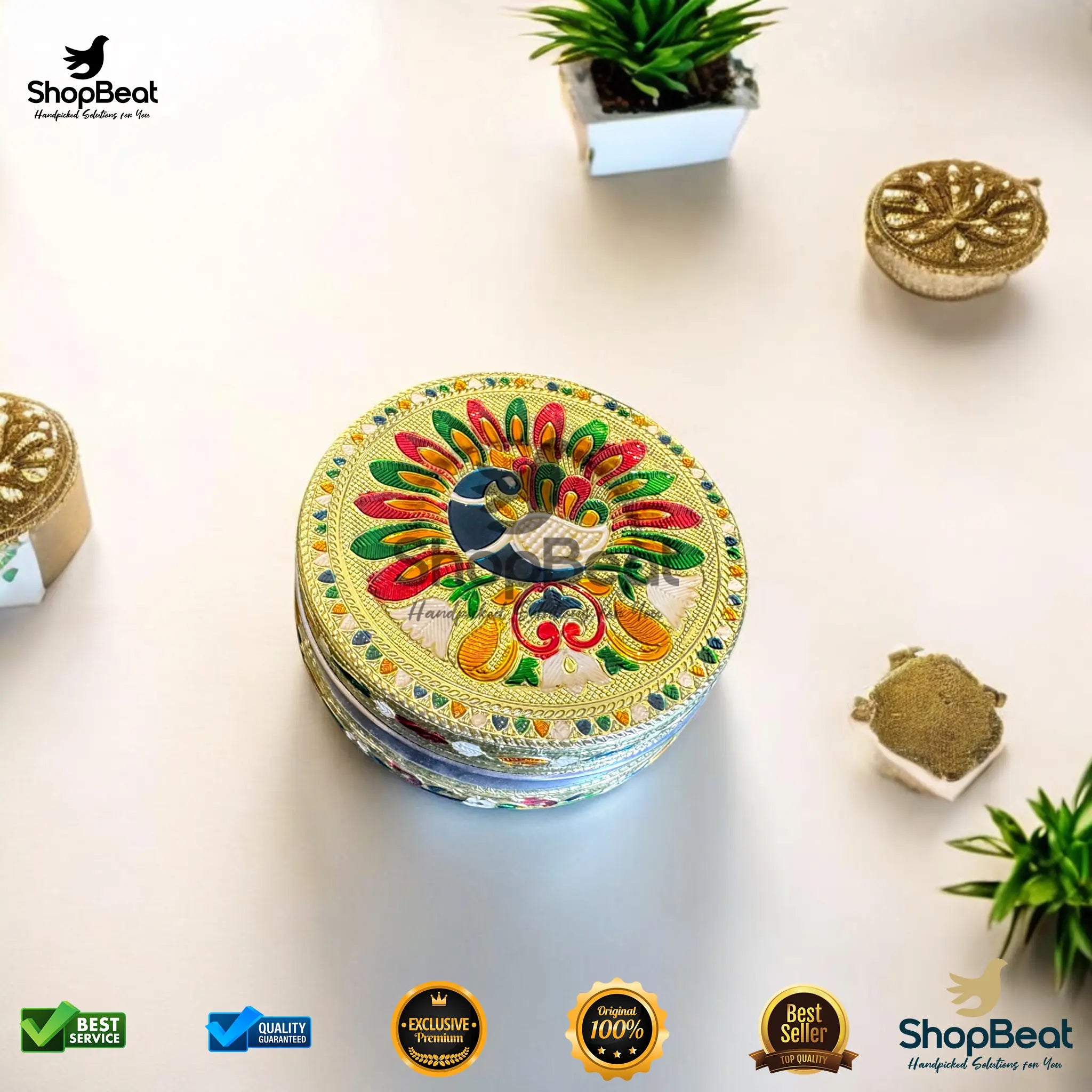 Golden Meenakari Peacock Steel Box – 8 No. Wedding Gift Container