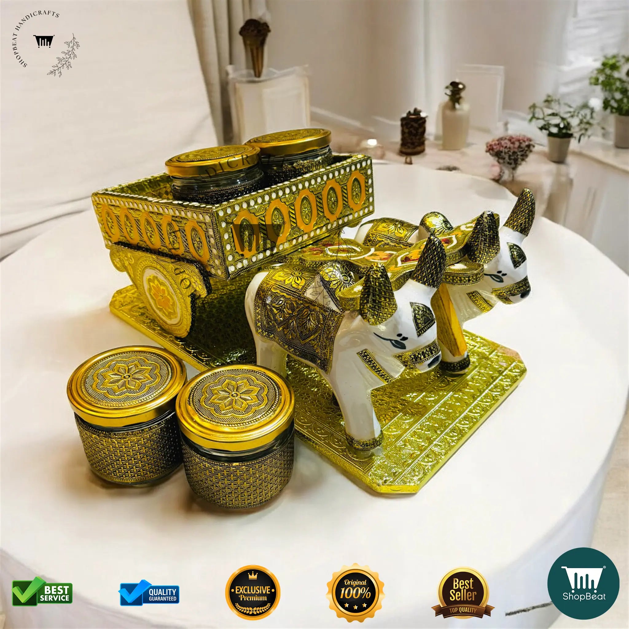 Celebrate traditions with the Golden Oxidised Bullock Cart Gift Box, a perfect blend of heritage and craftsmanship. This uniquely designed bullock cart-shaped gift box is crafted with a rich golden oxidised finish, adding an exquisite and royal appeal to your gifting needs.