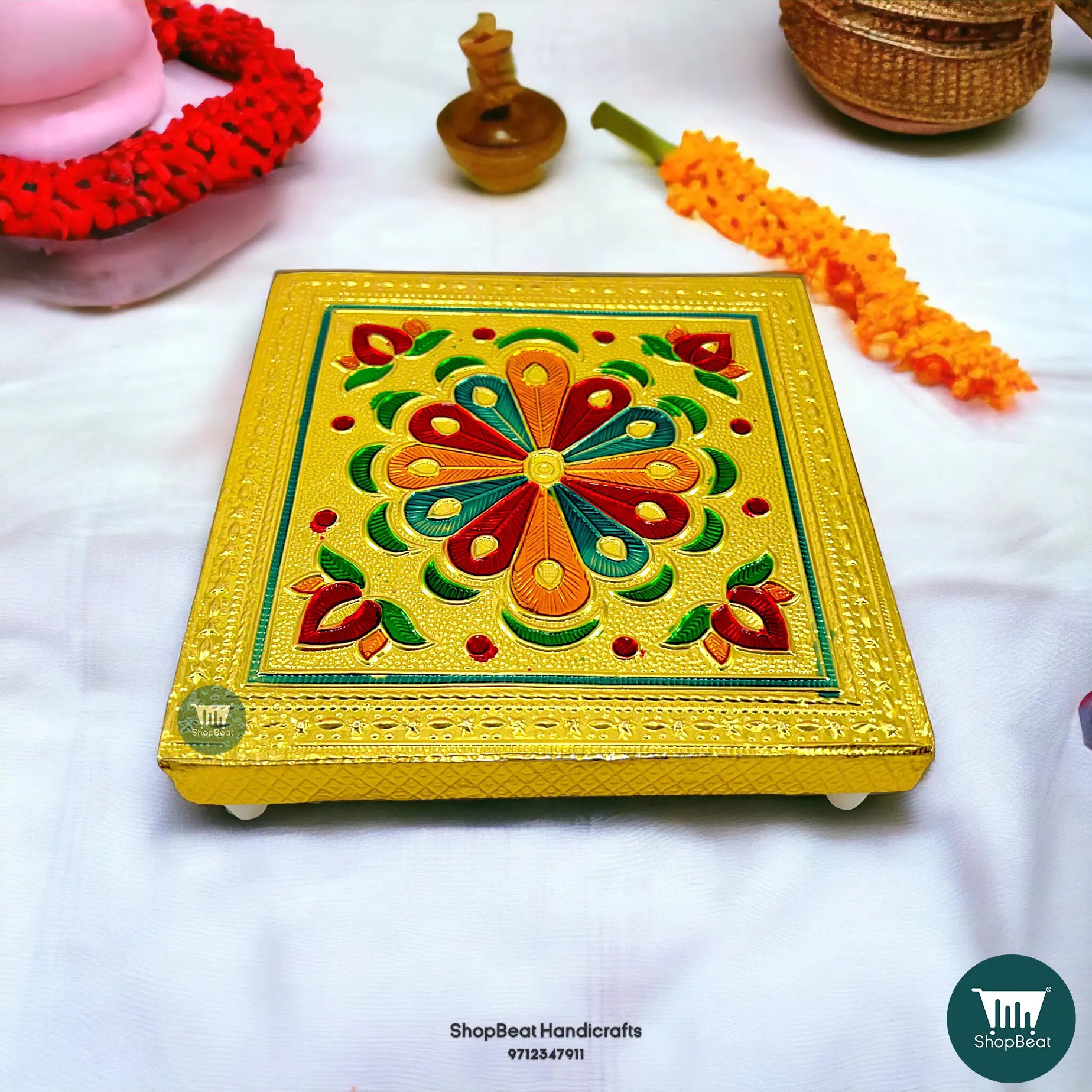 Golden Oxidised Flower Pooja Chowki – Wooden Bajot 6x6 Inch