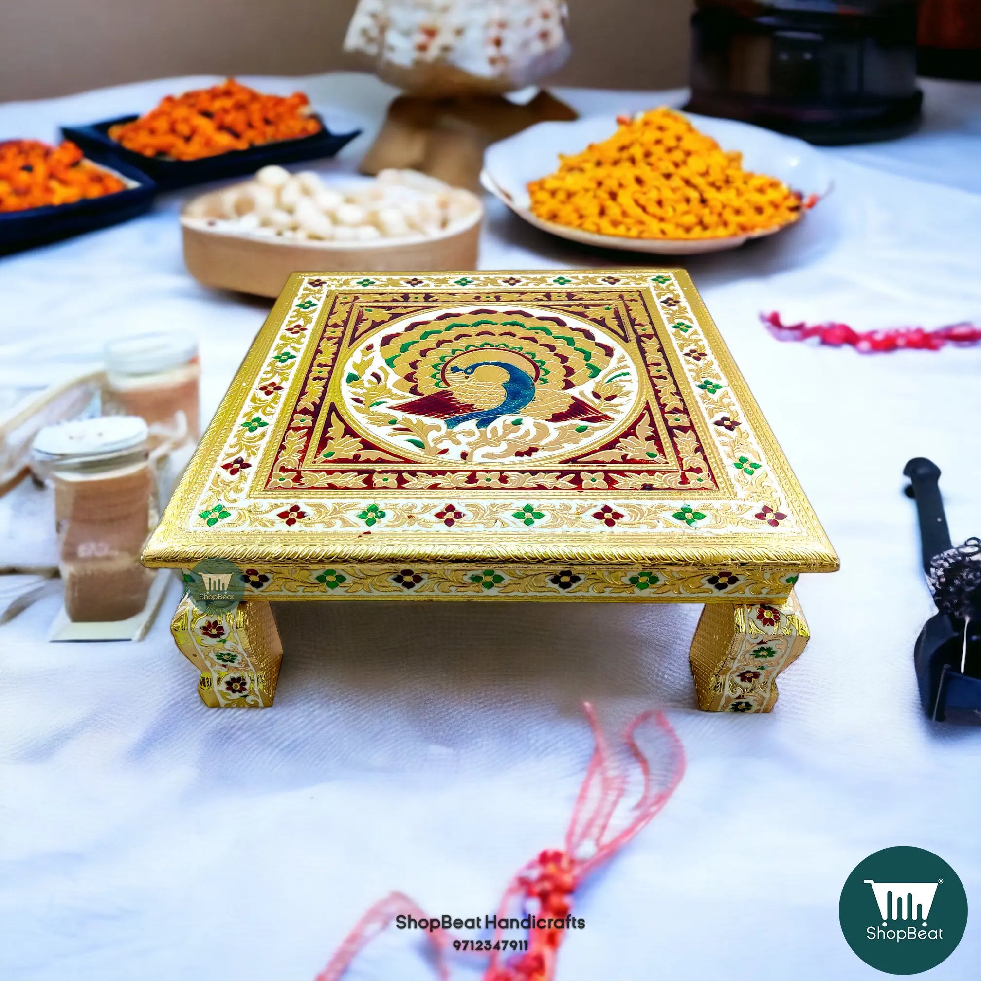 Golden Oxidised Meenakari Peacock Pooja Chowki – Wooden 15x15 Inch