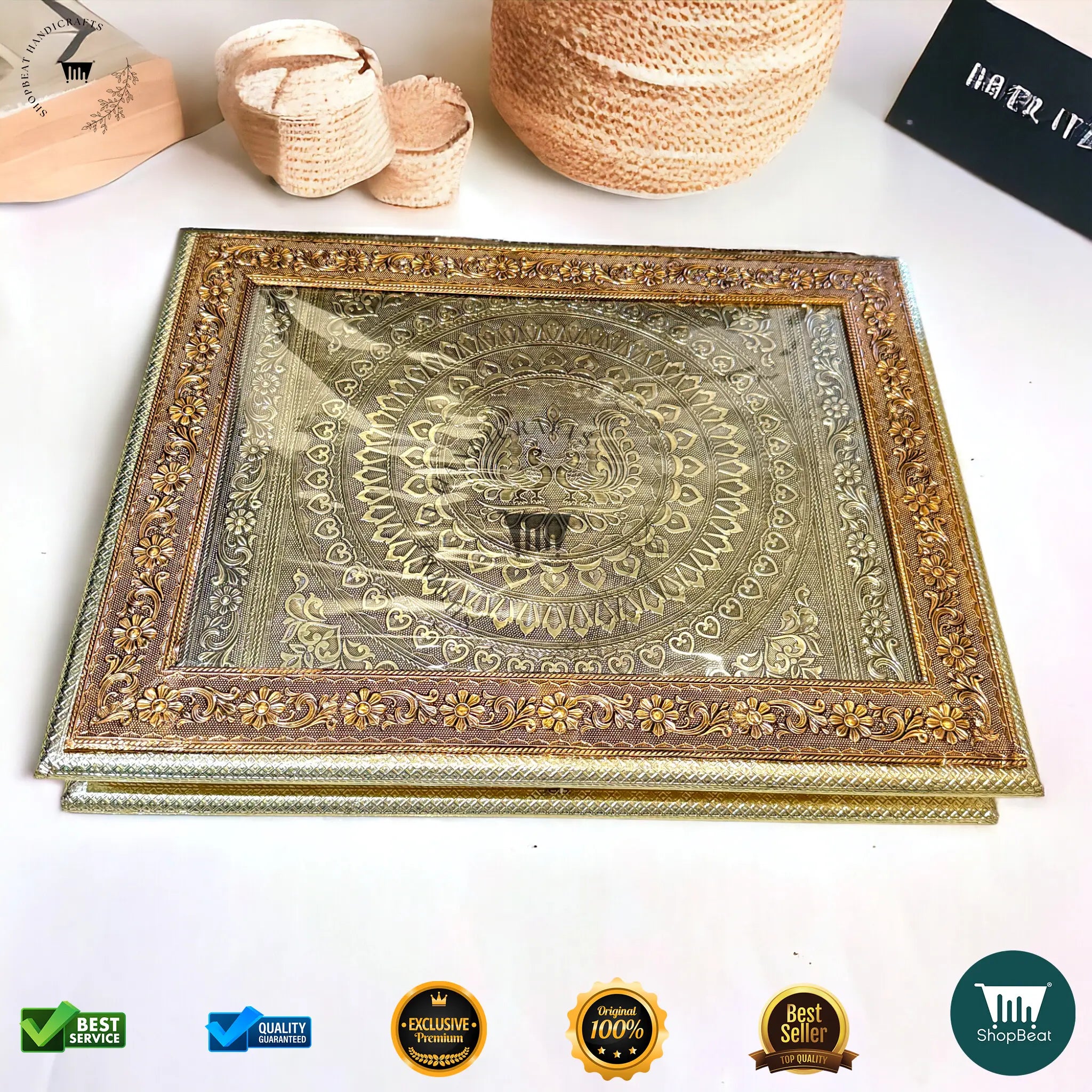 The Golden-Copper Oxidised Peacock Gift Box 14×18 is a luxurious and elegant handcrafted dry fruit box, designed for premium gifting. The golden-copper oxidised finish enhances its royal aesthetic, while the intricate peacock design symbolizes elegance and prosperity. Perfect for festivals, weddings, and corporate events, this decorative gift box is a timeless piece that blends tradition with modern craftsmanship.