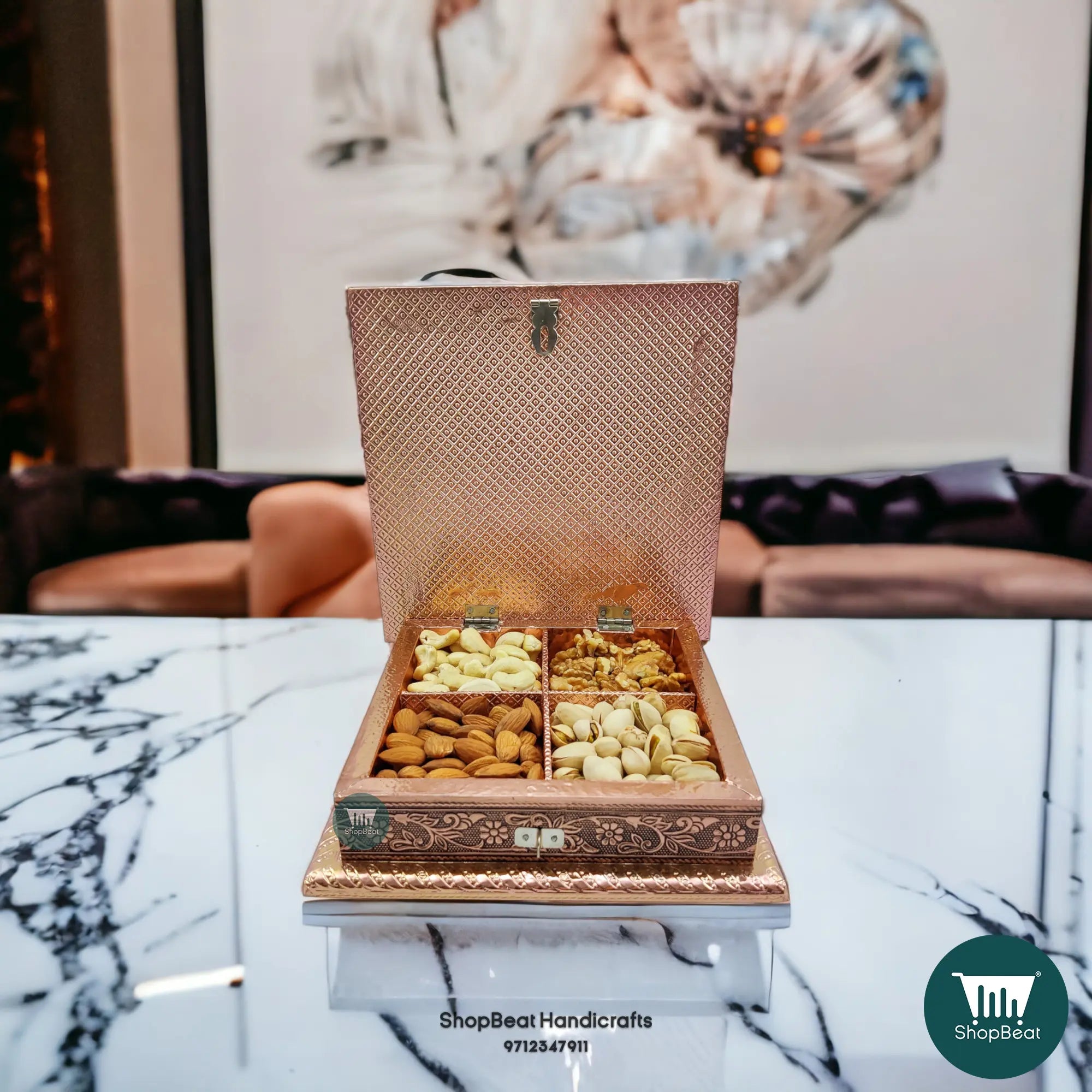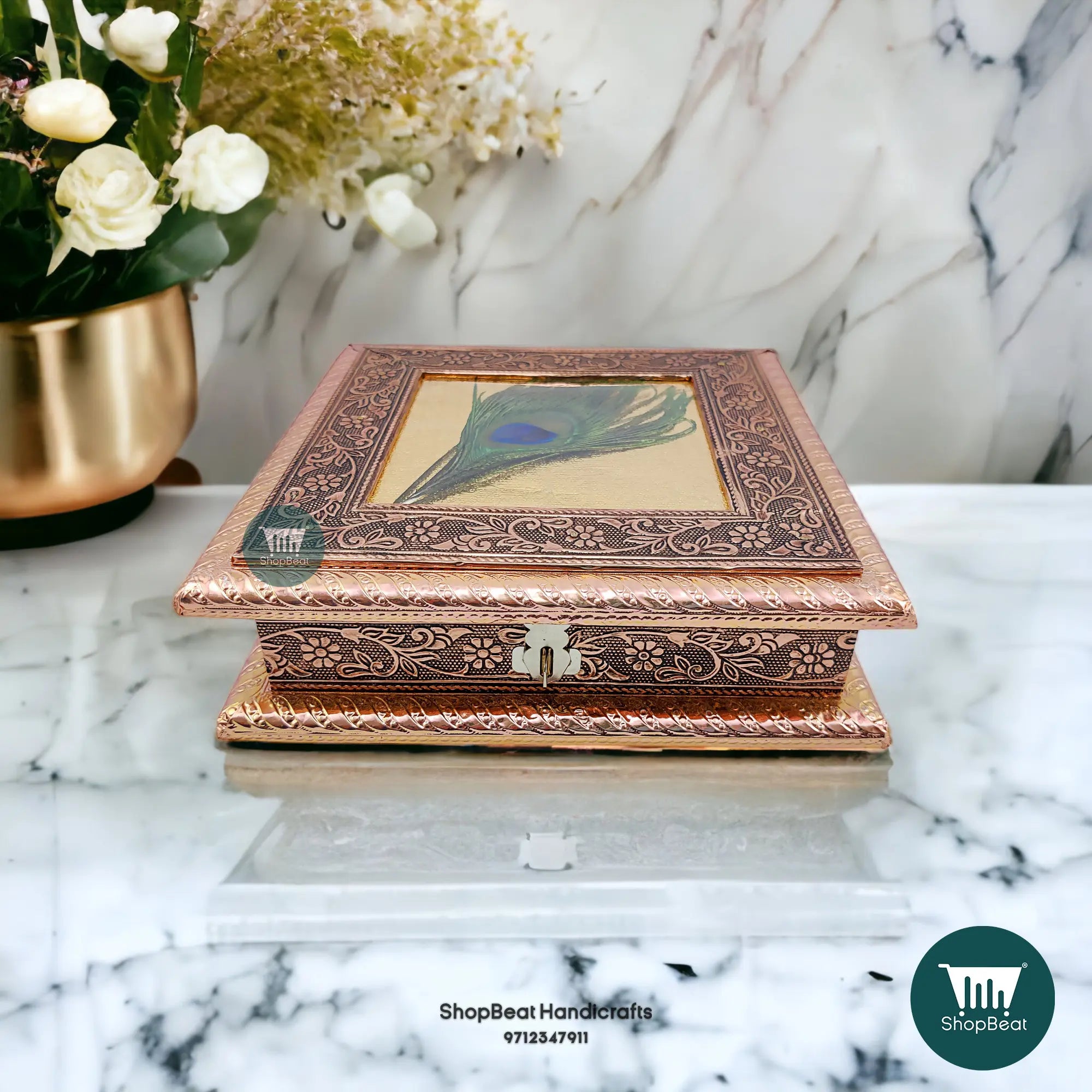 Copper Oxidised Wooden Dry Fruit Box – Peacock Feather 8x8 | ShopBeat