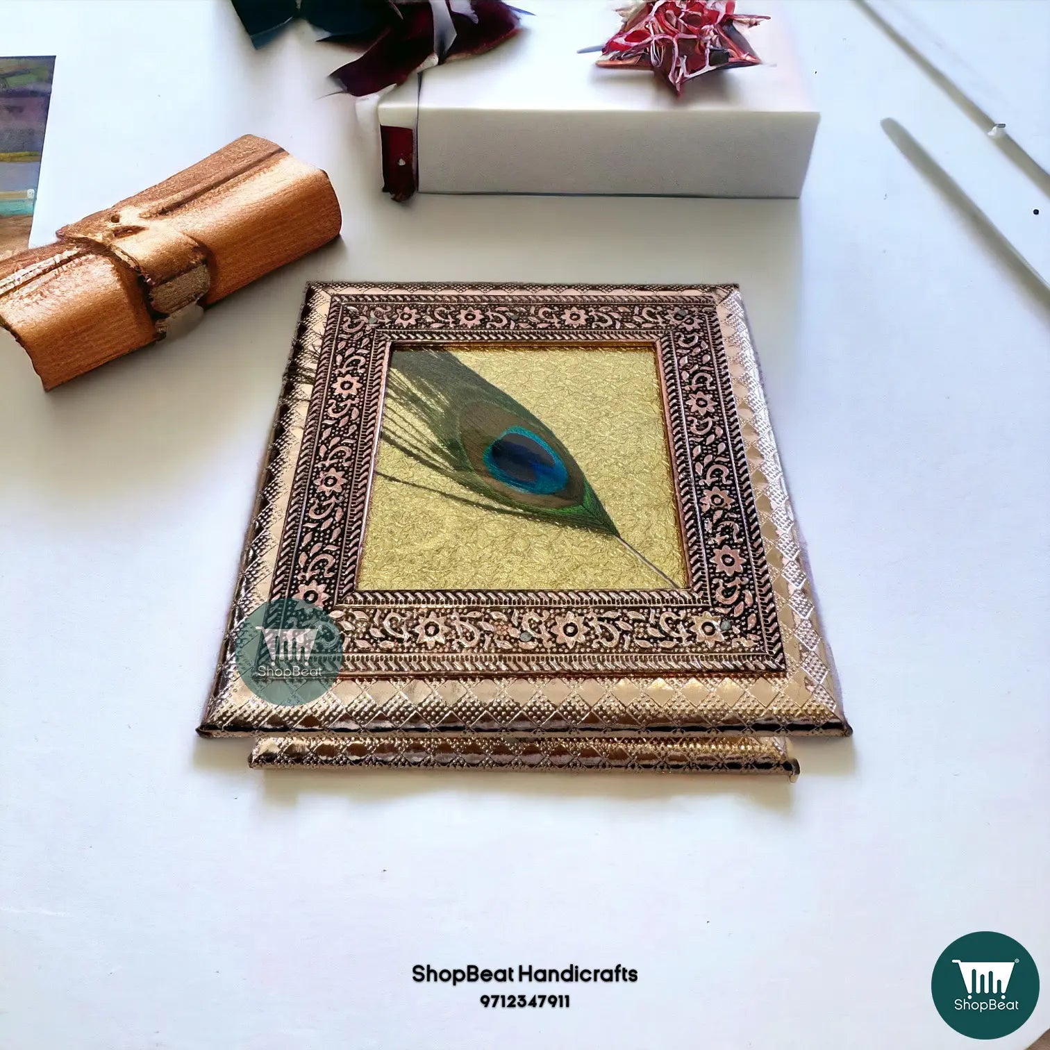 Crafted with precision, this 6×6-inch box combines the luxurious tones of copper and gold with a beautiful peacock feather design.