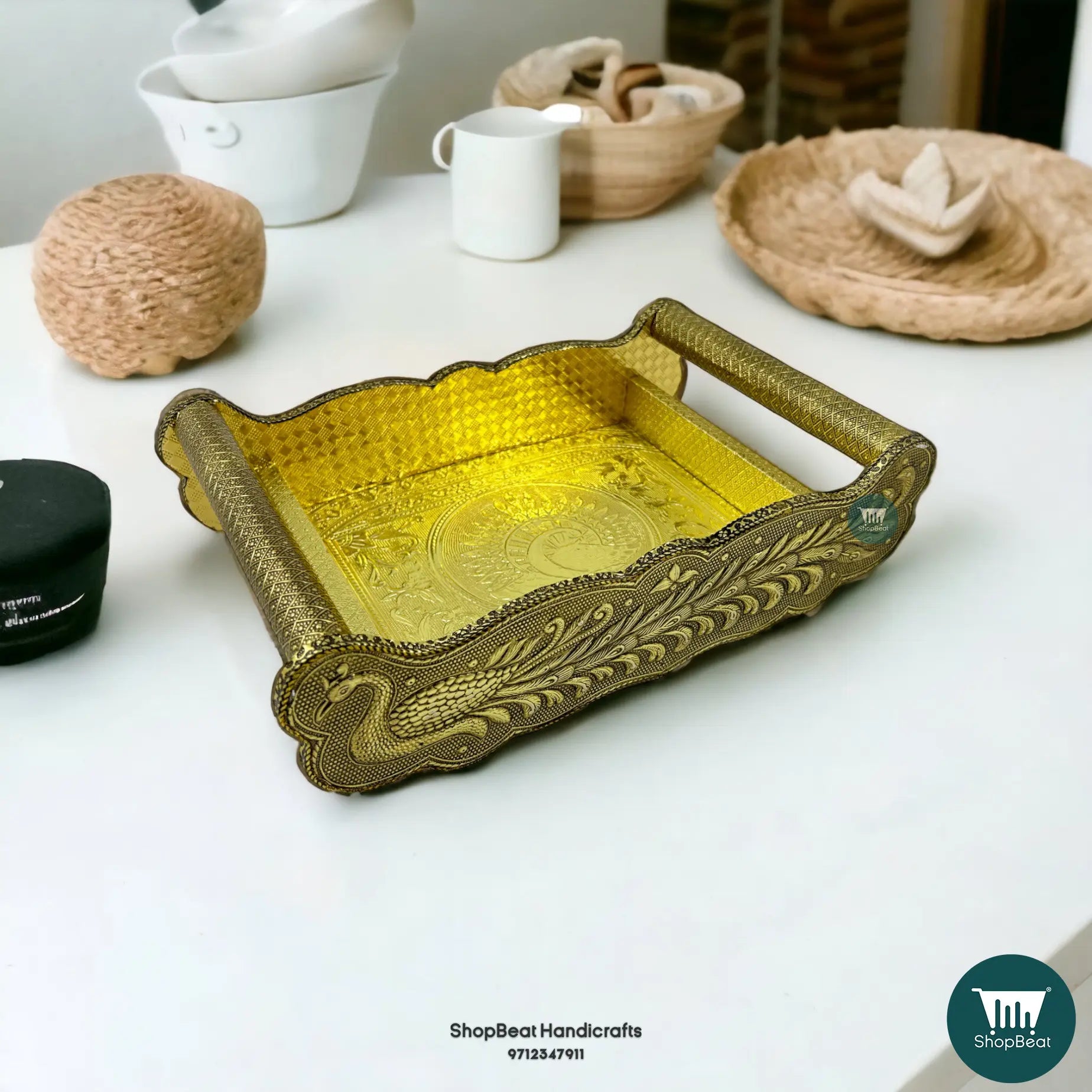 Golden Oxidised Peacock Wooden Serving Tray – Decorative Gift Tray