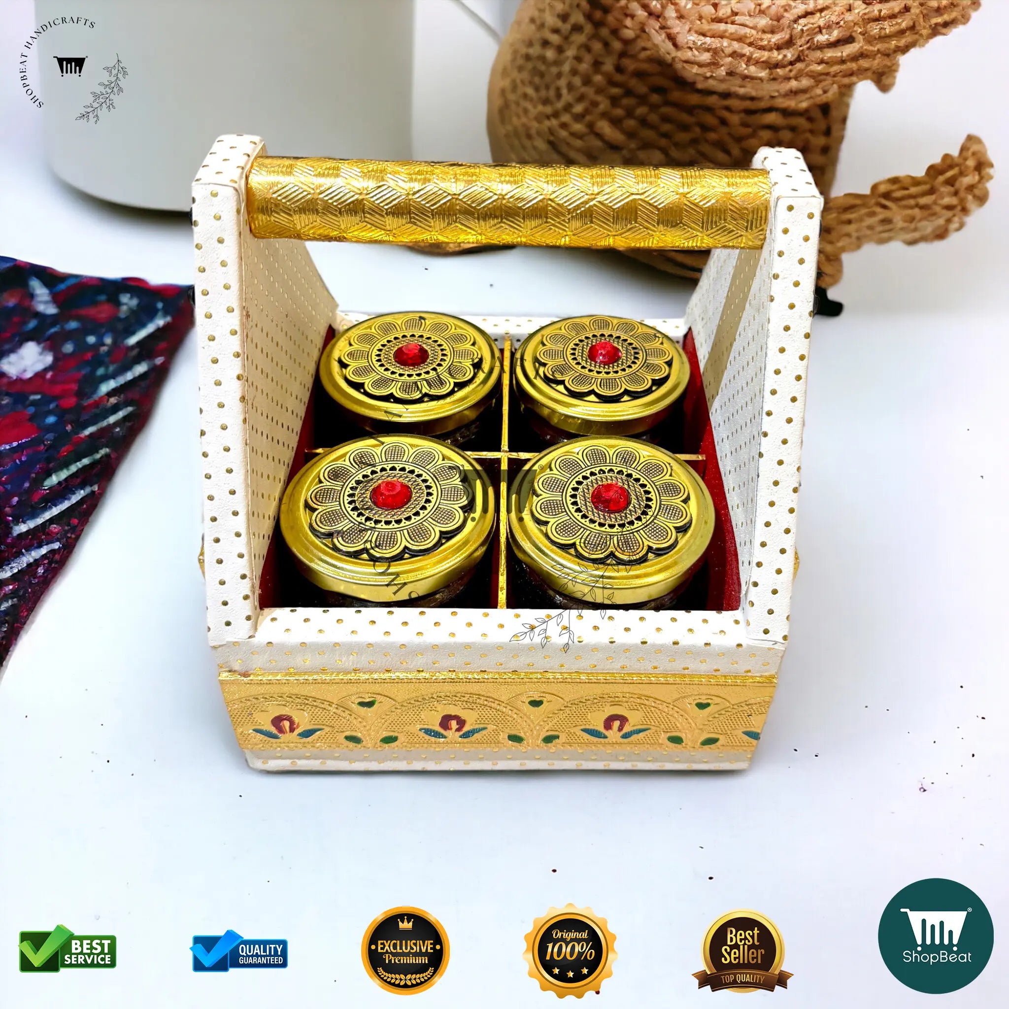 Premium Dry Fruit Tray Box – White Rexine with 4 Glass Jars (7x7 Inch)